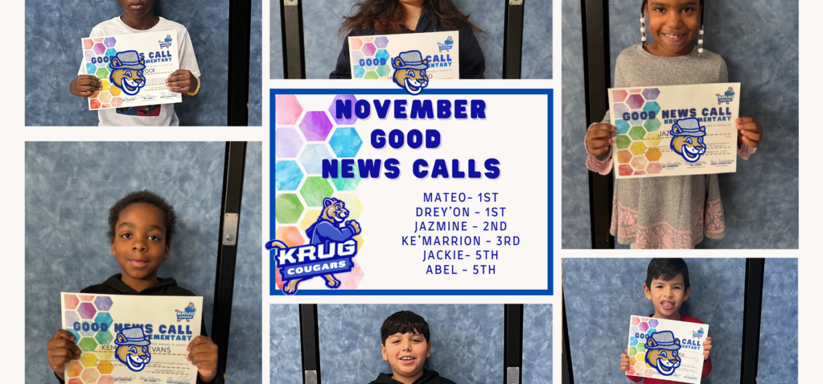 El personal de Krug puede nominar a los estudiantes que hayan demostrado liderazgo, esfuerzo continuo y mejora en la escuela. Una vez nominados, los estudiantes reciben un certificado y se llama a sus casas para compartir la noticia. Estos son los estudiantes que fueron nominados en noviembre. ¡Felicitaciones por su arduo trabajo!