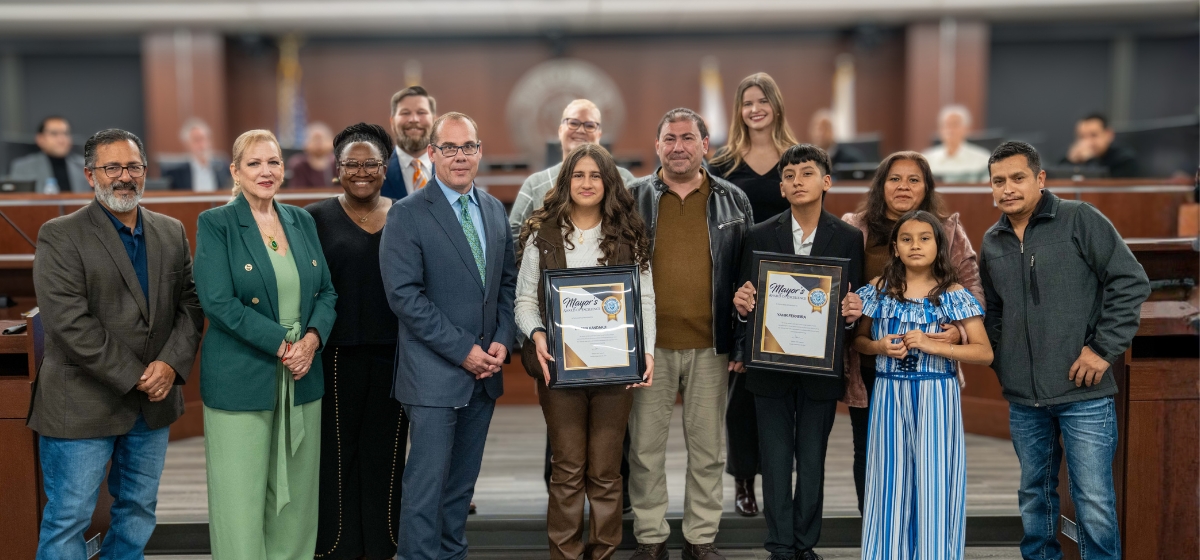 En la reunión del Comité Plenario del 18 de noviembre, el alcalde John Laesch reconoció a dos destacados estudiantes del Distrito Escolar East Aurora 131 que fueron nombrados recientemente Jóvenes Becarios Jack Kent Cooke.